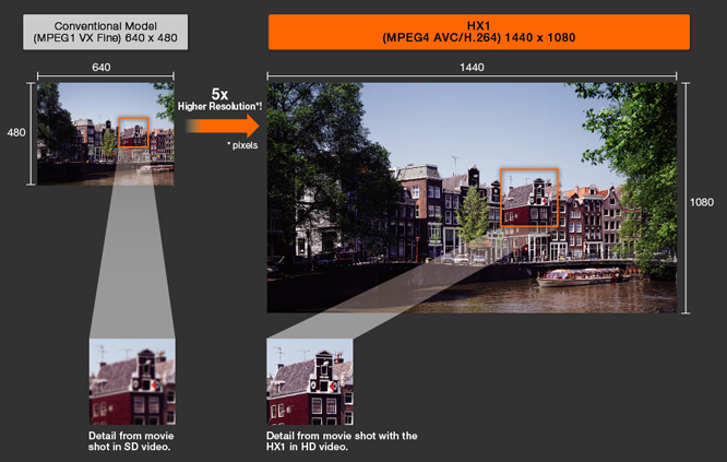 | A HX1 produz filmes de alta definição usando o formato MPEG-4 AVC/H.264*. Agora uma câmera padrão pode capturar filmes HD a 30 fps com resolução 1440 x 1080. Exibindo uma resolução cinco vezes maior do que filmes SD, os filmes ricos em detalhes revelam uma clareza de tirar o fôlego e cores incríveis. * MPEG-4 AVC/H.264, Perfil principal, 30 fps (aprox.), Progressivo, MP4/AAC |